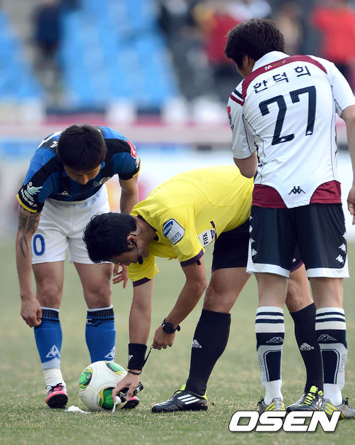 한국프로축구연맹 심판위원회가 K리그(클래식, 챌린지)에 새로 도입된 가이드라인을 직접 설명하고 시연하는 자리를 가졌다. 심판위원회는 22일 아산정책연구원에서 미디어 간담회를 실시, 이운택 연맹 심판위원장이 참석해 '2013 심판판정 가이드라인'에 대해 설명하고, 올 시즌 처음으로 도입해 사용 중인 베니싱 스프레이(Vanishing Spray)와 심판 전용 무전기 아크로-에스(Acro-S)에 대한 시연에 나섰다.