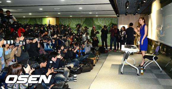 장윤정이 22일 오후 서울 상암동 SBS 프리즘타워에서 열린 결혼관련 기자회견에서 카메라를 향해 인사를 하고 있다.