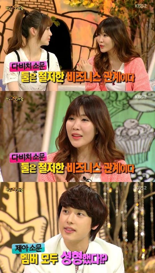 다비치는 22일 오후 방송된 KBS 예능프로그램 ‘대국민 토크쇼 안녕하세요’(이하 ‘안녕하세요’)에서 어떤 루머들이 있었냐는 MC 이영자의 질문에 “1집 때부터 사이가 안 좋고, 비즈니스 관계라는 소문이 있었다”고 답했다.