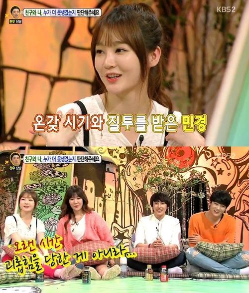 강민경은 22일 오후 방송된 KBS 예능프로그램 ‘대국민 토크쇼 안녕하세요’(이하 ‘안녕하세요’)에서 “고등학교 때 전학을 갔는데 가자마자 전따를 당했다”고 말했다.