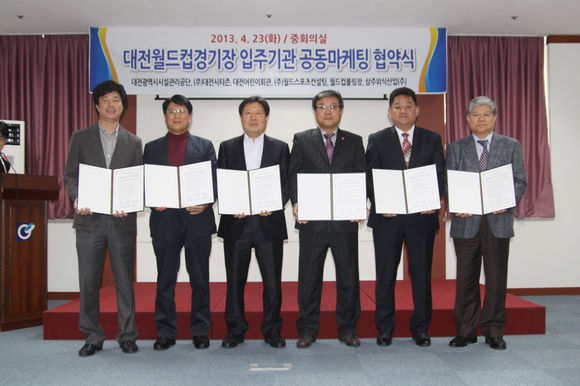 대전 시티즌은 23일 오전 대전월드컵경기장 중회의실에서 대전월드컵경기장 입주기관 간 협약식을 갖고 협력마케팅 및 경기장 운영 등 전반에 대한 상호 활성화 방안을 마련하기로 협의했다. 협약식에는 전종구 대전 대표이사를 비롯해 대전월드컵경기장에 입주해 있는 6개 기관 및 업체의 대표가 참석했다.