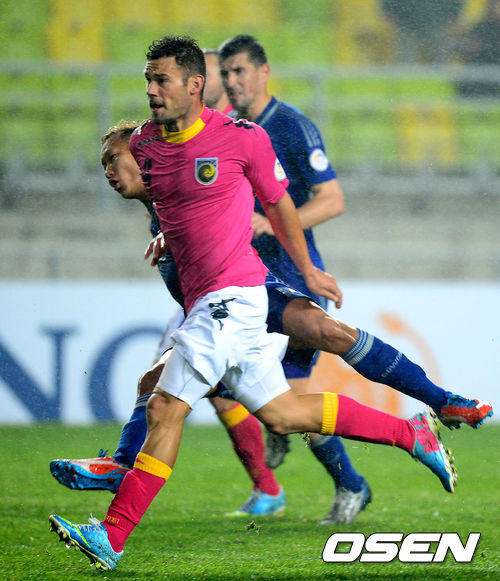 후반 수원 정대세가 센트럴 코스트 수비수에 앞서 슛을 날리고 볼을 바라보고 있다./jpnews@osen.co.kr