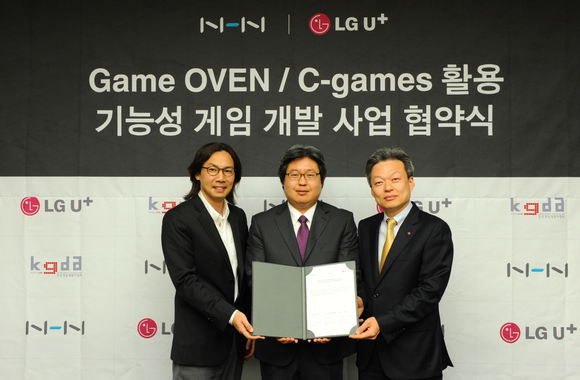 NHN과 LG유플러스는 23일 경기도 성남시 분당구에 위치한 NHN 사옥에서 기능성 게임 보급을 통한 건전한 콘텐츠 문화 조성을 목적으로 하는 ‘게임오븐·C-games 활용 기능성 게임 개발 사업 협약식’을 진행했다.