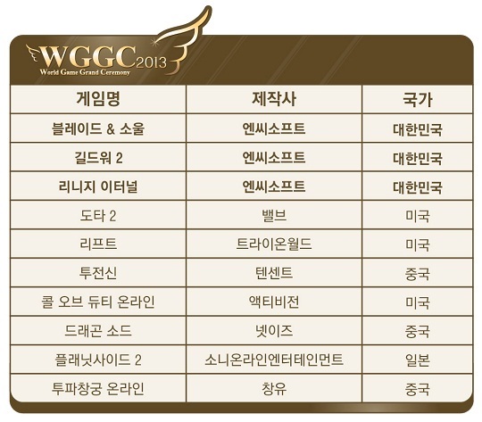 WGGC는 중국 게이머들의 투표로 선정되는 중국 최고 권위의 게임 시상식 중 하나로 올해 ‘중국 10대 온라인게임 기대작’에는 한국, 미국, 중국이 각 3개, 일본이 1개 뽑혔으며, 한국 작품 3 개는 모두 엔씨소프트 게임이다.