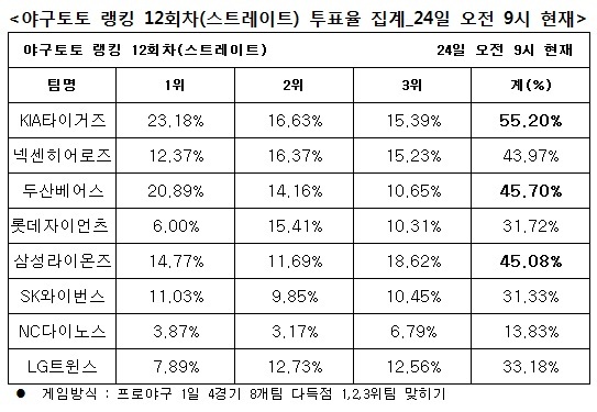 국민체육진흥공단(www.kspo.or.kr)이 발행하는 체육진흥투표권 수탁사업자인 스포츠토토 공식발매사이트인 베트맨(www.betman.co.kr)은 오는 25일에 개최되는 LG-삼성, 넥센-두산, 롯데-SK, NC-KIA 등 4경기 8개팀을 대상으로 한 야구토토 랭킹 12회차 스트레이트 게임 중간집계결과 KIA(55.20%), 두산(45.70%), 삼성(45.08%)을 차례로 다득점 상위 3개팀으로 꼽았다고 밝혔다. 반면 SK(31.33%)와 NC(13.83%)는 가장 적은 득점을 기록할 것으로 예상했다.