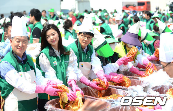 명형섭 대상 대표, 배우 전지현(왼쪽부터) 등이 24일 오후 서울 광화문에서 열린 서울시사회복지협의회와 함께하는 '청정원 사랑의 반찬나눔' 행사에 참여해 김치만들기 중 포즈를 취하고 있다.
