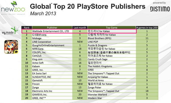 게임관련 국제 시장조사기업 ‘뉴주’(www.newzoo.com)가 발표한 3월 전 세계 ‘탑 20 모바일 퍼블리셔: 플레이스토어’ 순위에서 위메이드가 1위를 차지했다.