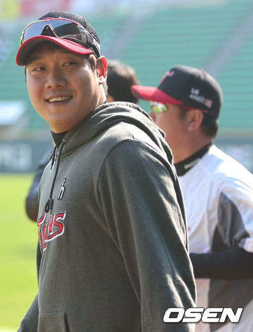 24일 오후 서울 잠실야구장에서 열리는 '2013 한국야쿠르트 세븐 프로야구' LG 트윈스 대 삼성 라이온즈의 경기를 앞두고 1군에 합류한 LG 류제국이 팀 동료들과 연습 중 미소짓고 있다.