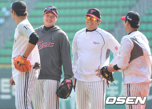 24일 오후 서울 잠실야구장에서 열리는 '2013 한국야쿠르트 세븐 프로야구' LG 트윈스 대 삼성 라이온즈의 경기를 앞두고 1군에 합류한 LG 류제국이 팀 동료들과 연습 중 미소짓고 있다.
