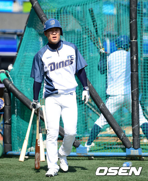 24일 오후 창원 마산야구장에서 열린 2013 한국야쿠르트 세븐프로야구 NC 다이노스와 KIA 타이거즈의 경기, 경기에 앞서 NC 지석훈이 타격 훈련을 마치고 덕아웃으로 향하고 있다.