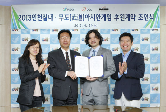 2014 인천아시아경기대회조직위원회(위원장 김영수)는 24일 당구용품 브랜드 민테이블사(대표 민상준)와 2013 인천실내&무도(武道)아시안게임 당구 경기에 사용될 당구테이블에 대한 현물 후원과 현금계약을 체결했다.