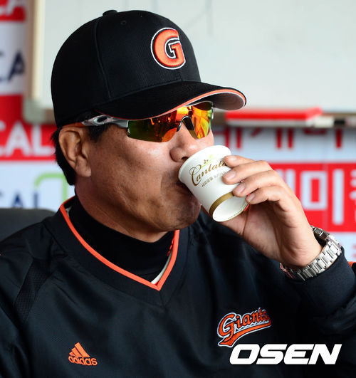 24일 오후 부산 사직구장에서 열리는 '2013 한국야쿠르트 세븐 프로야구' 롯데 자이언츠와 SK 와이번스의 경기 시작 전 김시진 감독이 덕아웃에서 음료를 마시고 있다.
