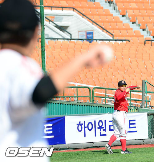24일 오후 부산 사직구장에서 열리는 '2013 한국야쿠르트 세븐 프로야구' 롯데 자이언츠와 SK 와이번스의 경기 시작 전 조인성이 외야로 훈련을 하기위해 나가면서 강민호와 이야기를 나누고 있다.