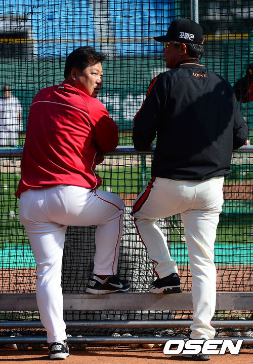 24일 오후 부산 사직구장에서 열리는 '2013 한국야쿠르트 세븐 프로야구' 롯데 자이언츠와 SK 와이번스의 경기 시작 전 이만수 감독과 김시진 감독이 이야기를 나누고 있다.