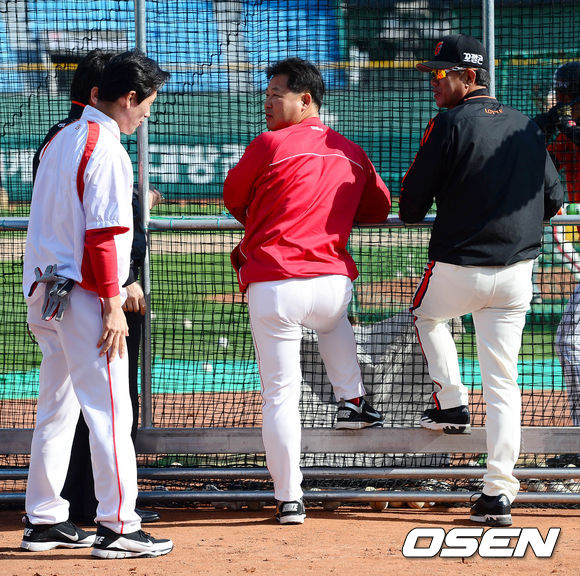 24일 오후 부산 사직구장에서 열리는 '2013 한국야쿠르트 세븐 프로야구' 롯데 자이언츠와 SK 와이번스의 경기 시작 전 성준 코치가 김시진 감독에게 인사를 하고 있다.