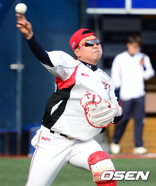 24일 오후 창원 마산야구장에서 열린 2013 한국야쿠르트 세븐프로야구 NC 다이노스와 KIA 타이거즈의 경기, 경기에 앞서 KIA 김상훈이 포수 훈련을 하고 있다.