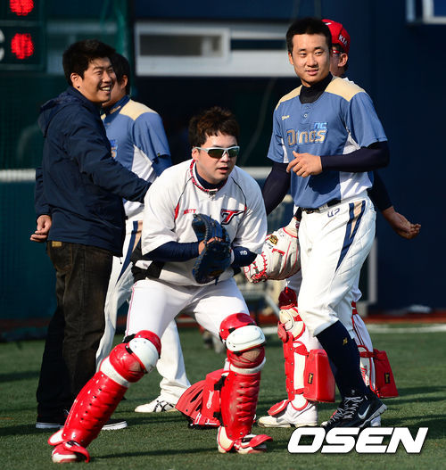 24일 오후 창원 마산야구장에서 열린 2013 한국야쿠르트 세븐프로야구 NC 다이노스와 KIA 타이거즈의 경기, 경기에 앞서 NC 김태군이 훈련 중인 차일목을 바라보며 덕아웃으로 가고 있다.