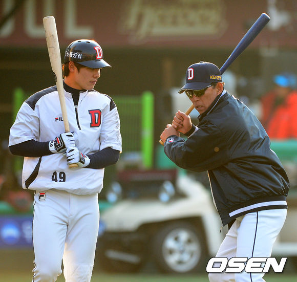 24일 오후 서울 목동야구장에서 열리는 '2013 한국야쿠르트 세븐 프로야구' 넥센 히어로즈와 두산 베어스의 경기에 앞서 두산 민병헌이 송재박 코치의 지도를 받고 있다.