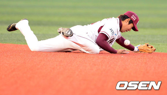 24일 오후 서울 목동야구장에서 열린 '2013 한국야쿠르트 세븐 프로야구' 넥센 히어로즈와 두산 베어스의 경기, 1회초 2사 1,2루에서 넥센 강정호가 허도환의 2루 송구에 깜짝 놀라며 볼을 잡아내고 있다.