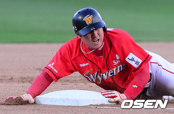 24일 오후 부산 사직구장에서 열린 '2013 한국야쿠르트 세븐 프로야구' 롯데 자이언츠와 SK 와이번스의 경기 1회초 2사 1루 한동민의 좌익수 앞 1루타, 최정이 3루까지 쇄도해 세이프되고 있다.