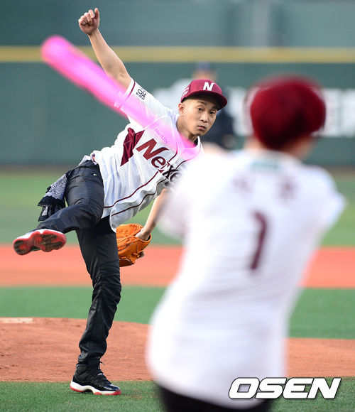 24일 오후 서울 목동야구장에서 열린 '2013 한국야쿠르트 세븐 프로야구' 넥센 히어로즈와 두산 베어스의 경기, 일렉트로보이즈 마부스가 시구, 차쿤이 시타를 하고 있다.