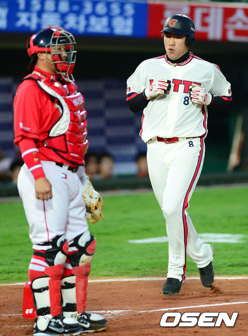 24일 오후 부산 사직구장에서 열린 '2013 한국야쿠르트 세븐 프로야구' 롯데 자이언츠와 SK 와이번스의 경기 2회말 1사 2,3루 장성호의 2타점 적시타, 1루주자 전준우가 홈을 밟고 있다.