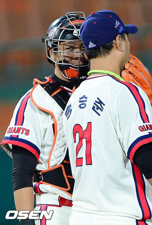 24일 오후 부산 사직구장에서 열린 '2013 한국야쿠르트 세븐 프로야구' 롯데 자이언츠와 SK 와이번스의 경기 3회초 2사 2루 박정권의 타석, 강민호와 송승준이 마운드에서 이야기를 나누고 있다.