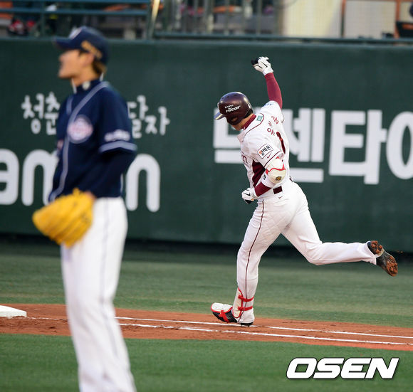 24일 오후 서울 목동야구장에서 열린 '2013 한국야쿠르트 세븐 프로야구' 넥센 히어로즈와 두산 베어스의 경기, 2회말 2사 2루에서 넥센 유한준이 투런홈런을 날리고 주먹을 들며 그라운드를 돌고 있다.