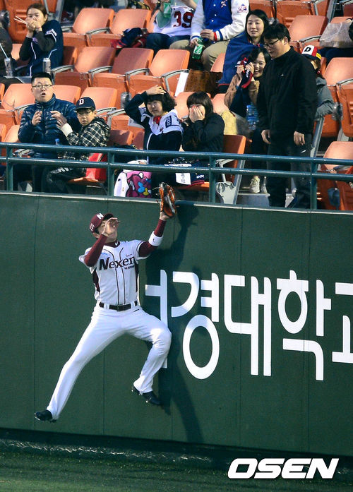 24일 오후 서울 목동야구장에서 열린 '2013 한국야쿠르트 세븐 프로야구' 넥센 히어로즈와 두산 베어스의 경기, 3회초 2사 2루에서 넥센 유한준이 두산 김동주의 파울 플라이 타구를 몸 날려 잡아내고 있다.