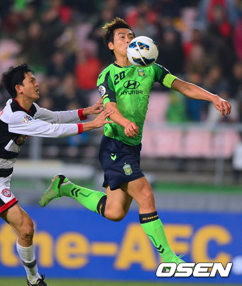 24일 오후 전북 전주시 전주월드컵경기장에서 열린 2013 아시아챔피언스리그(ACL) 전북 현대(한국)와 무앙통 유나이티드(태국)의 경기, 전반 전북 이동국이 가슴으로 트래핑을 하고 있다