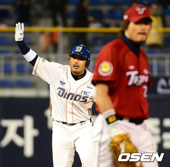 24일 오후 창원 마산야구장에서 열린 2013 한국야쿠르트 세븐프로야구 NC 다이노스와 KIA 타이거즈의 경기, 3회말 1사 3루에서 NC 이호준이 중전 적시 2루타를 치고 타임을 외치고 있다.