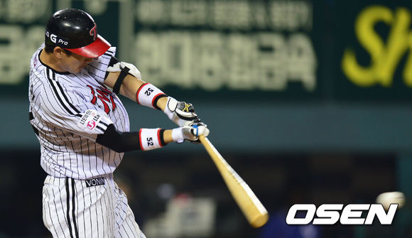 24일 오후 서울 잠실야구장에서 '2013 한국야쿠르트 세븐 프로야구' LG 트윈스 대 삼성 라이온즈의 경기가 열렸다. 4회말 LG 공격 1사 1, 3루 상황 7번 손주인이 1타점 동점 적시타를 날리고 있다.