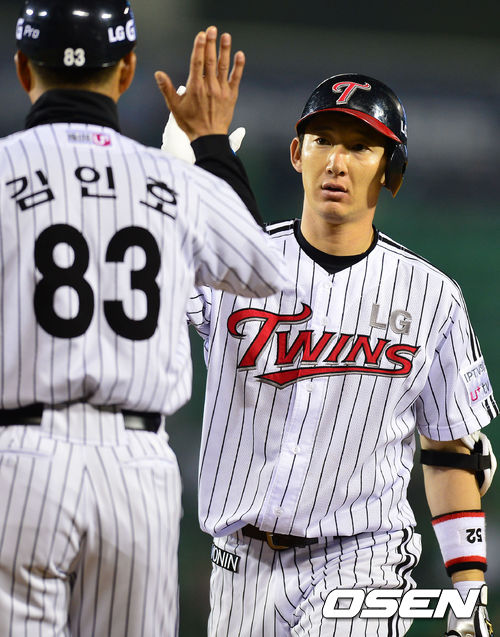 24일 오후 서울 잠실야구장에서 '2013 한국야쿠르트 세븐 프로야구' LG 트윈스 대 삼성 라이온즈의 경기가 열렸다. 4회말 LG 공격 1사 1, 3루 상황 7번 손주인이 1타점 동점 적시타를 날리고 김인호 1루 코치와 인사를 나누고 있다.