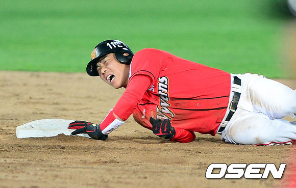 24일 오후 부산 사직구장에서 열린 '2013 한국야쿠르트 세븐 프로야구' 롯데 자이언츠와 SK 와이번스의 경기 5회초 무사 1루 이명기의 타석, 정근우가 2루 도루에 성공한 가운데, 오른손 쪽에 고통을 호소하고 있다.