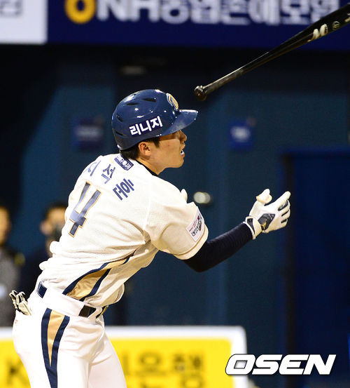 24일 오후 창원 마산야구장에서 열린 2013 한국야쿠르트 세븐프로야구 NC 다이노스와 KIA 타이거즈의 경기, 3회말 무사 1루에서 NC 지석훈이 중전 적시타를 치고 있다.