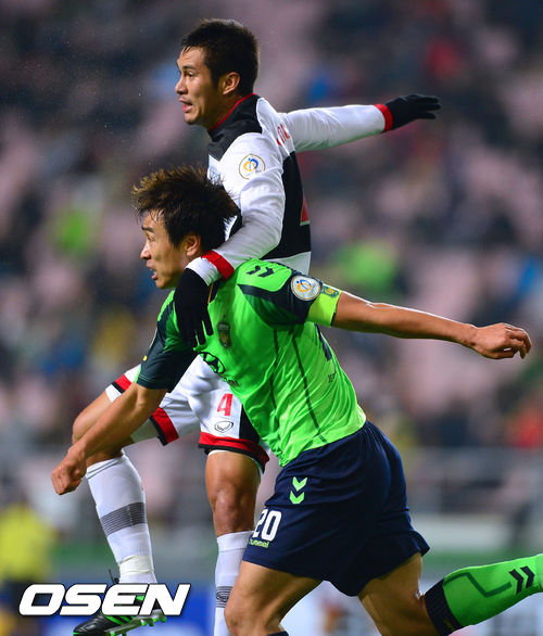24일 오후 전북 전주시 전주월드컵경기장에서 열린 2013 아시아챔피언스리그(ACL) 전북 현대(한국)와 무앙통 유나이티드(태국)의 경기, 전반 전북 이동국이 무앙통 수비와 공중볼을 다투고 있다