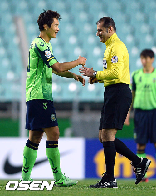 24일 오후 전북 전주시 전주월드컵경기장에서 열린 2013 아시아챔피언스리그(ACL) 전북 현대(한국)와 무앙통 유나이티드(태국)의 경기, 후반 시작에 앞서 무앙통 선수들이 경기 시작을 지연 시키자 주심과 전북 이동국이 미소 짓고 있다