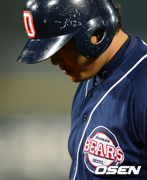 24일 오후 서울 목동야구장에서 열린 '2013 한국야쿠르트 세븐 프로야구' 넥센 히어로즈와 두산 베어스의 경기, 5회초 2사 1,3루에서 두산 김동주가 3루땅볼로 물러나며 아쉬워하고 있다.