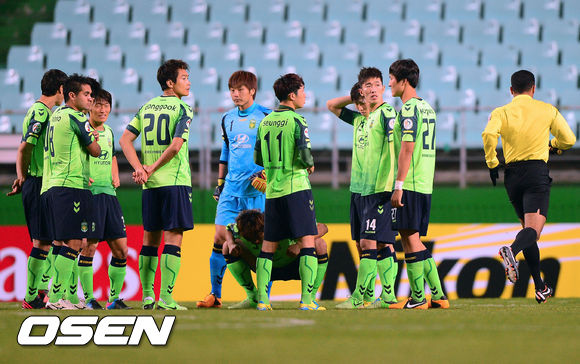 24일 오후 전북 전주시 전주월드컵경기장에서 열린 2013 아시아챔피언스리그(ACL) 전북 현대(한국)와 무앙통 유나이티드(태국)의 경기, 후반 시작에 앞서 무앙통 선수들이 경기 시작을 지연 시키자 전북 선수들이 의아한 표정을 짓고 있다.