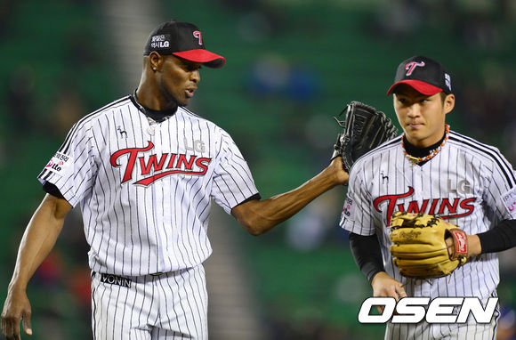 24일 오후 서울 잠실야구장에서 '2013 한국야쿠르트 세븐 프로야구' LG 트윈스 대 삼성 라이온즈의 경기가 열렸다. 6회초 삼성 공격 1사 1루 상황 6번 신명철을 병살로 이끌며 이닝을 마무리지은 LG 선발 리즈가 유격수 오지환과 인사를 나누고 있다.