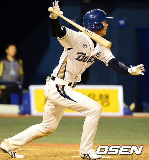24일 오후 창원 마산야구장에서 열린 2013 한국야쿠르트 세븐프로야구 NC 다이노스와 KIA 타이거즈의 경기, 4회말 무사 만루에서 NC 김종호가 희생플라이를 날리고 있다.