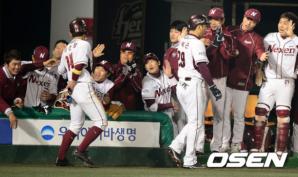 24일 오후 서울 목동야구장에서 열린 '2013 한국야쿠르트 세븐 프로야구' 넥센 히어로즈와 두산 베어스의 경기, 5회말 2사 1,3루에서 넥센 박병호의 2타점 적시 2루타에 서건창과 이택근이 홈을 밟고 동료선수들과 하이파이브를 하고 있다.