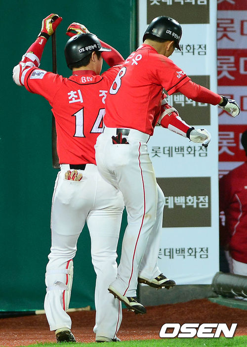 24일 오후 부산 사직구장에서 열린 '2013 한국야쿠르트 세븐 프로야구' 롯데 자이언츠와 SK 와이번스의 경기 6회초 1사 1,2루 정근우가 스리런 홈런을 친 후 덕아웃에 들어가며 최정과 세리머니를 하고 있다.
