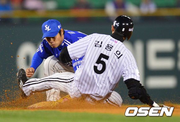 24일 오후 서울 잠실야구장에서 '2013 한국야쿠르트 세븐 프로야구' LG 트윈스 대 삼성 라이온즈의 경기가 열렸다. 6회말 LG 공격 1사 주자없는 상황 6번 김용의가 좌전안타를 날리고 2루까지 내달리다 삼성 2루수 김태완의 태그에 걸려 아웃되고 있다.