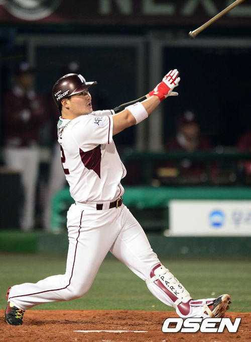 24일 오후 서울 목동야구장에서 열린 '2013 한국야쿠르트 세븐 프로야구' 넥센 히어로즈와 두산 베어스의 경기, 5회말 2사 1,3루에서 넥센 박병호가 2타점 적시 2루타를 날리고 타구를 바라보고 있다.