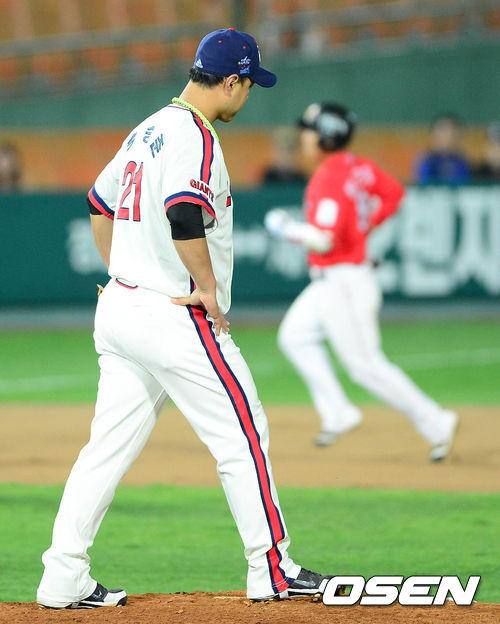 24일 오후 부산 사직구장에서 열린 '2013 한국야쿠르트 세븐 프로야구' 롯데 자이언츠와 SK 와이번스의 경기 6회초 1사 1,2루 정근우에게 스리런포를 허용한 송승준이 고개를 떨구고 있다.