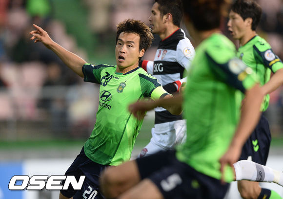 24일 오후 전북 전주시 전주월드컵경기장에서 열린 2013 아시아챔피언스리그(ACL) 전북 현대(한국)와 무앙통 유나이티드(태국)의 경기, 후반 전북 이동국이 오프사이드때 골을 넣고 환호하고 있다.