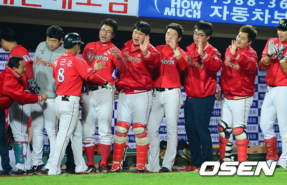 24일 오후 부산 사직구장에서 열린 '2013 한국야쿠르트 세븐 프로야구' 롯데 자이언츠와 SK 와이번스의 경기 6회초 1사 1,2루 정근우가 스리런포를 친 후 덕아웃에서 동료들과 하이파이브를 하고 있다.