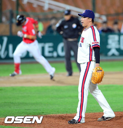 24일 오후 부산 사직구장에서 열린 '2013 한국야쿠르트 세븐 프로야구' 롯데 자이언츠와 SK 와이번스의 경기 7회초 선두타자 한동민에게 솔로포를 허용한 김사율이 마운드에 서 있다.