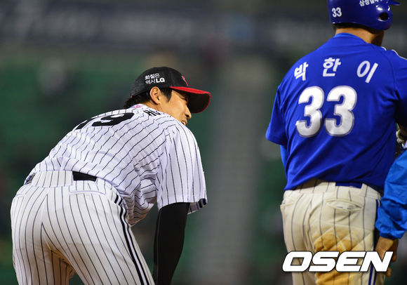 24일 오후 서울 잠실야구장에서 '2013 한국야쿠르트 세븐 프로야구' LG 트윈스 대 삼성 라이온즈의 경기가 열렸다. 7회초 삼성 공격 2사 2, 3루 상황 2번 박한이에게 2타점 역전 적시타를 허용한 LG 투구 정현욱이 아쉬워하고 있다.